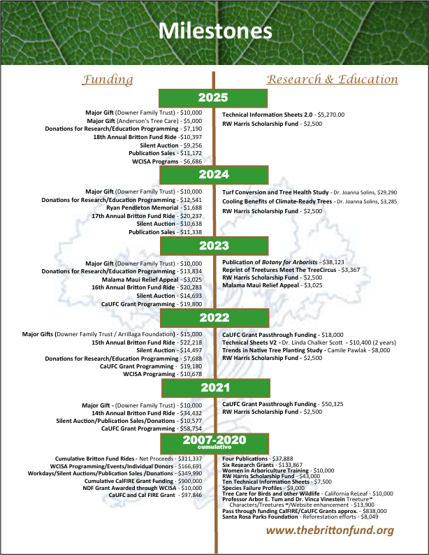 The Britton Fund, Inc. is a 501c3 organization. Federal Tax ID #68-0634735. Contributions may be tax deductible under IRS regulations. Our mission is to provide funding for research and education to benefit the field of arboriculture and urban forestry with emphasis on issues inherent to the geographic area of California, Nevada, Arizona, and Hawaii.